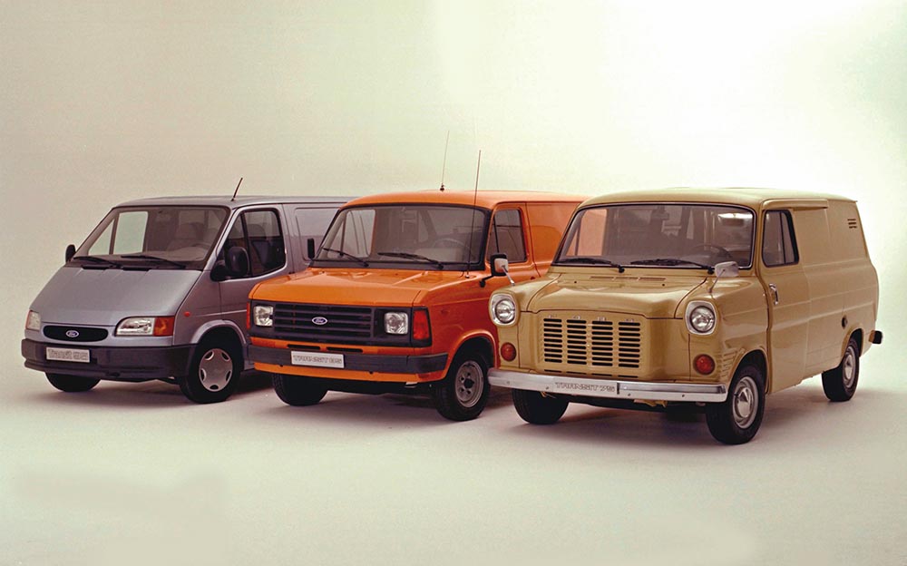 1965: Vom Ford FK 1000 (1953-1962) und Ford Taunus Transit (1961-1965) wurden insgesamt 255.832 Einheiten verkauft. Ford Deutschland und Ford Großbritannien präsentieren am 9. August den neuen Transit als erstes gemeinschaftliches europäisches Entwicklungsprojekt. Verkaufsstart ist im Oktober. Die Motorenauswahl umfasst anfangs einen 1,2-Liter mit 33 kW (45 PS), einen 1,5-Liter mit 44 kW (60 PS) sowie einen 1,7 Liter mit 48 kW (65 PS). Die Motoren sind auch in der Pkw-Taunus-Baureihe (12 M, 15 M und 17 M) im Einsatz. Die rechtsgelenkten britischen Transit-Varianten weichen mit eigenen Motoren deutlich ab, im Programm sind dort ein 1,7-Liter Benziner (54 kW/73 PS) und ein 2,0-Liter Benziner (63 kW/85 PS)