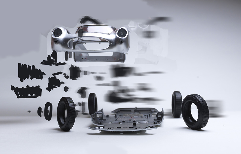 Bei den drei Bildern der Serie Disintegrating (Zerfallen) handelt es sich um explodierende Aufnahmen von klassischen Sportautos, die Fabian mühsam erstellt hat, in dem er in Kleinarbeit massstabgetreue Oldtimer-Modelle zerlegte, danach jeden Teil, Stück für Stück, in einer ganz besonderen Position fotografierte und so die Illusion eines explodierenden Fahrzeugs erzeugte.