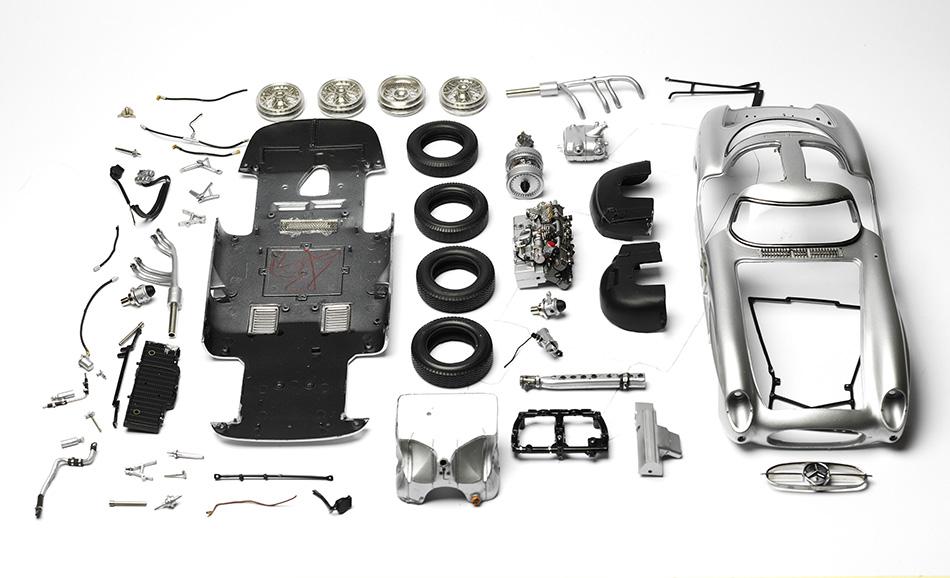 Die Abbilder zeigen explodierende Aufnahmen klassischer Sportwägen: Komplizierte massstabgetreue Modelle eines Mercedes-Benz 300 SLR Uhlenhaut Coupé mit Flügeltüren (1954), – der so schön ist, dass man fast weinen muss -, eines schnittigen, schwarzen Kultjaguars E-Typ (1961) oder eines kurvenreichen sinnlichen Ferrari 330 P4 (1967).