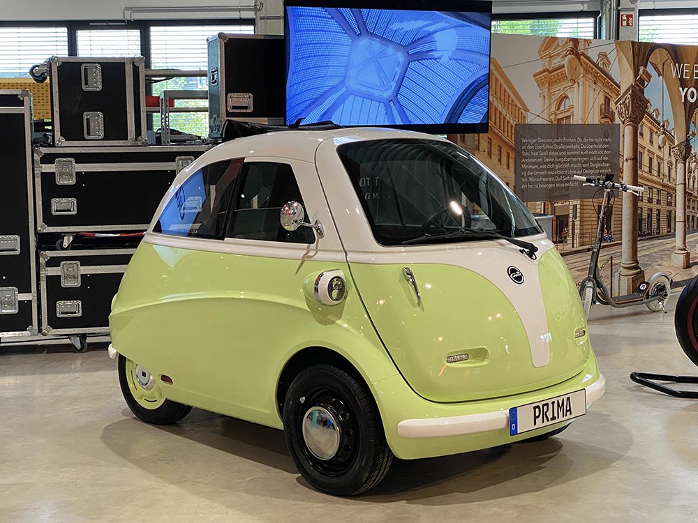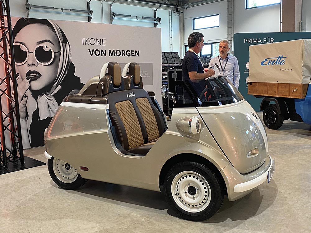 Die Herzen nicht nur der älteren Generation dürfte die Evetta ansprechen. Der Name des vollelektrischen vierrädrigen Leichtfahrzeugs für die Stadt setzt sich aus „Electric Vehikel“ und „Isetta“ zusammen, womit die Verknüpfung zur Knutschkugel aus den Fünfziger Jahren hergestellt ist. Denn die Evetta erinnert in Form und Funktion an das Unikum aus der Wirtschaftswunderzeit mit der nach vorn öffnenden Tür, in der das Lenkrad integriert ist. Das Interieur der zweisitzigen Kabine ist von puristischer Praktikabilität gekennzeichnet. Großer Vorteil für die Stadt: Das gerade mal 2,48 Meter lange und 1,50 Meter breite Gefährt passt auch quer in eine Parknische. Die Evetta fährt bis zu 90 km/h schnell, seine Entwickler versprechen eine Reichweite von bis zu 240 Kilometern, die sich an einer Schnellladesäule oder der Haushaltssteckdose wieder aufladen lassen.