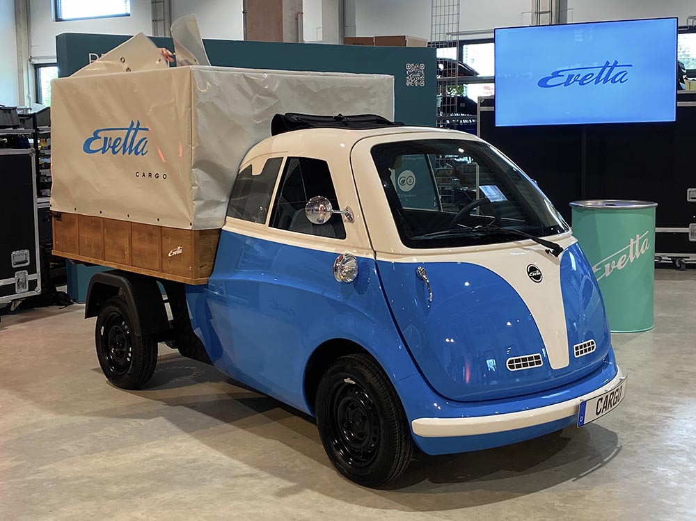 Ursprünglich wurde die Evetta von der Firma Artega entwickelt. ElectricBrands übernahm von dort sämtliche Projektideen, die Entwicklungspläne sowie die kleine Fertigungsstraße, die jetzt in Rosdorf bei Göttingen steht. Neben kleineren Optimierungen am Basismodell haben sie das Angebot um eine Cargo- und Cabrio-Variante ausgebaut. Ab 22. Juli ist die Evetta online bestellbar, produziert werden soll sie ab Sommer 2023: Das Basismodell Prima soll 16.000 Euro kosten, die Cabrio-Variante Openair ab 21.000 Euro und die Lastenversion Cargo rund 18.500 Euro.