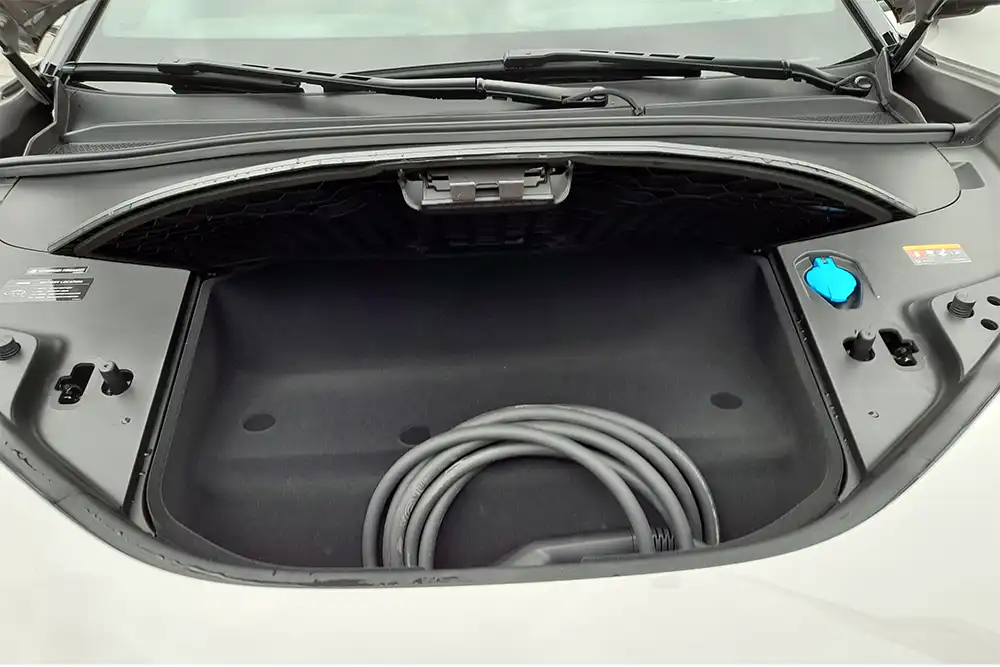 Platzangebot und Sitzkomfort vorne sind über alle Zweifel erhaben, hier kann man es locker eine Akkufüllung lang aushalten. Im Fond des Testwagens waren die als Extra angebotenen zwei Einzelsitze mit breiter Armauflage und kleinem Display etwa zur Klimatisierungs-Bedienung montiert. Die bieten zwar guten Seitenhalt, sind aber recht straff gepolstert. Serienmäßig ist hinten eine Dreier-Sitzbank eingebaut. Platz ist in beiden Versionen reichlich vorhanden. Wie auch im Kofferraum, der als Viersitzer 611 Liter Volumen bietet. Beim Fünfsitzer sind es 688 bis 1.532 Liter, im Frunk unter der knappen Motorhaube lassen sich nochmal 46 Liter verstauen – also etwa das Ladekabel und sonstiger Kleinkram.