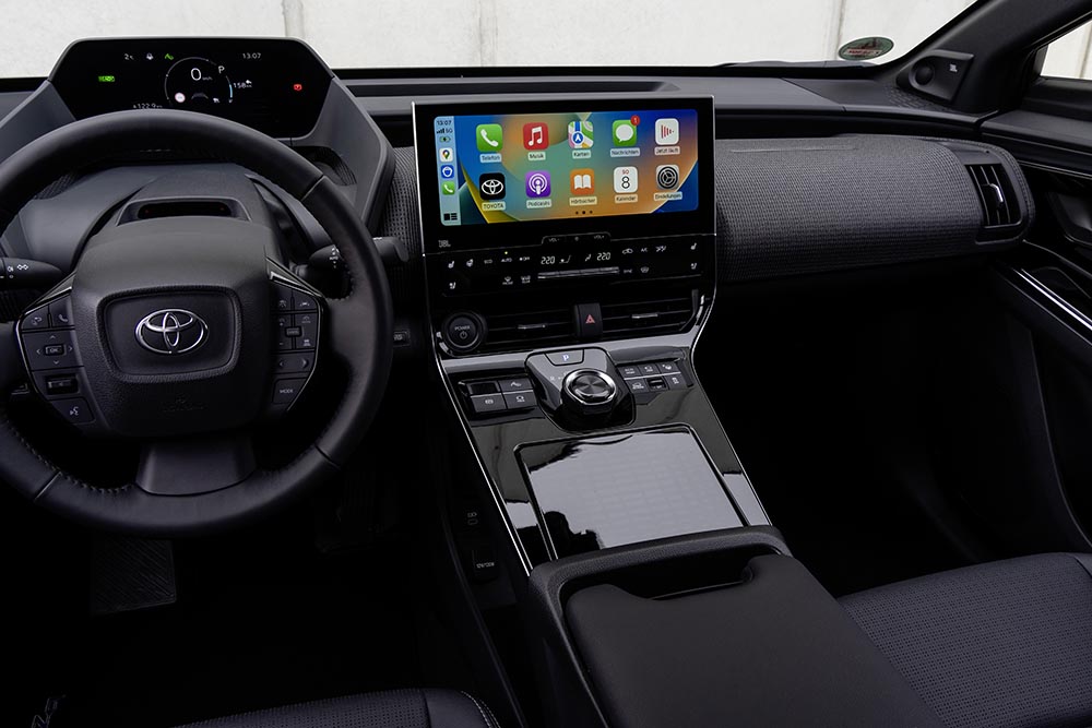 Doch das Laden unterwegs hat auch seine guten Seiten: Man soll sich ab und zu schließlich eine Pause können. Und wer keine Lust hat, sich währenddessen die Beine zu vertreten, kann ja mit dem umfangreichen Infotainment hantieren. Der bis zu 12,3 Zoll große Touchscreen lädt zum fröhlichen Bedienen ein, denn die Oberfläche reagiert wirklich feinfühlig. Neu ist, dass Toyota inzwischen auch erlaubt, die Oberfläche des eigenen Smartphones per Apple CarPlay oder Android Auto auf den Fahrzeugmonitor zu spiegeln. Und ebenfalls neu ist die Position des Lenkrads, die ein bisschen an die Innenräume der Autos aus dem Hause Peugeot erinnern. Je nach Einstellung verdeckt es nämlich das selbstverständlich aus reinem Display bestehende Kombiinstrument. Muss man sich eben daran gewöhnen. Genauso wie an den Umstand, dass Toyota jetzt Elektroautos baut. Und dann noch welche mit einer solch kryptischen Bezeichnung.