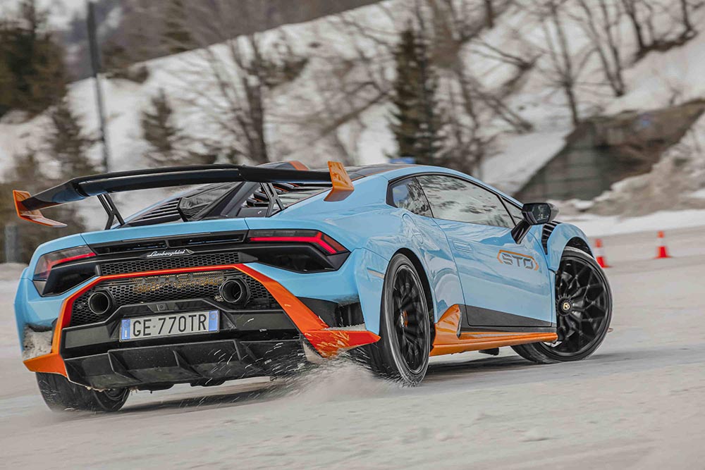 Auftakt ist eine „Ice Experience“ auf der Südseite vom Matterhorn, bei der wir materialschonendes Driften mit Heck- und Allradantrieb auf vereister Freifläche üben. Verblüffend spielerisch lässt sich hier das Huracan Evo Coupé im Querfahrmodus durch den kurvenreichen Pylonen-Parcours führen. Ein aufmerksamer Gasfuß und geschicktes Timing beim Lenken reichen, die von Regelelektronik und variabler Kraftverteilung unterstützte Flunder auf Kurs zu halten. Spielerisch fahren wir Achten mit quer gestelltem Heck und 360-Grad-Drehungen. Ganz anders der heckgetriebene Huracan STO, der beim ersten Gasstoß sein Hinterteil in kecker Weise seitlich rausstellt und dem Fahrer umgehend ein breites Grinsen beschert. „Wenn ein Lambo, dann der!“, kommt einem schlagartig in den Sinn. Doch braucht es beim RWD-Huracan ein Profi-Popometer, um ihn in gleicher Weise durch den Parcours zu führen. Bei der 360-Grad-Pirouette bleibt fast jeder am 180-Grad-Punkt hängen. Das Spiel mit Gas und Lenkung verlangt hier nach deutlich mehr Präzision.